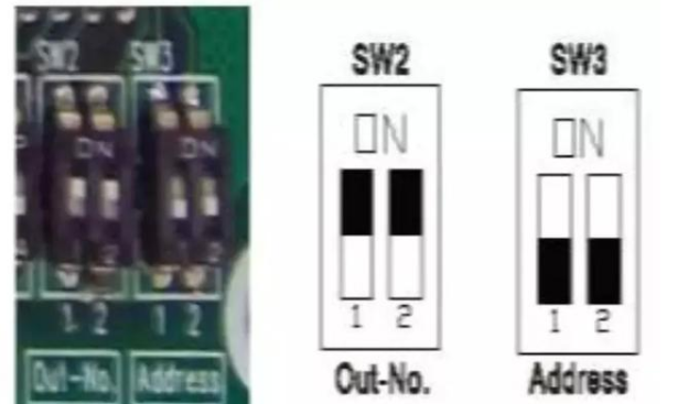 地址碼(Address)為2號,第一位撥碼開關撥到數字方向,撥碼位置是“OFF、ON”方向,數量碼(Out)為3臺,兩位撥碼開關為“ON、OFF”,轉接碼和地址碼一樣。