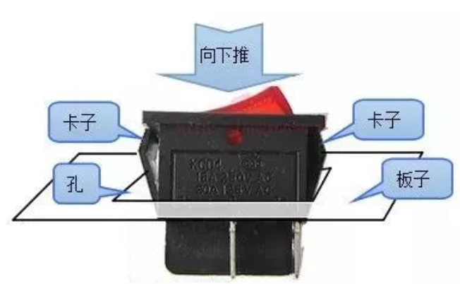 安裝的時候,船型翹板開關兩側面有兩個開口卡子,將開關對準板子上的孔向下推,等待卡子將開關固定在板子上即可。